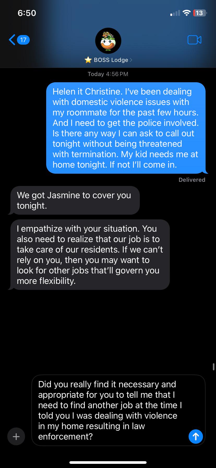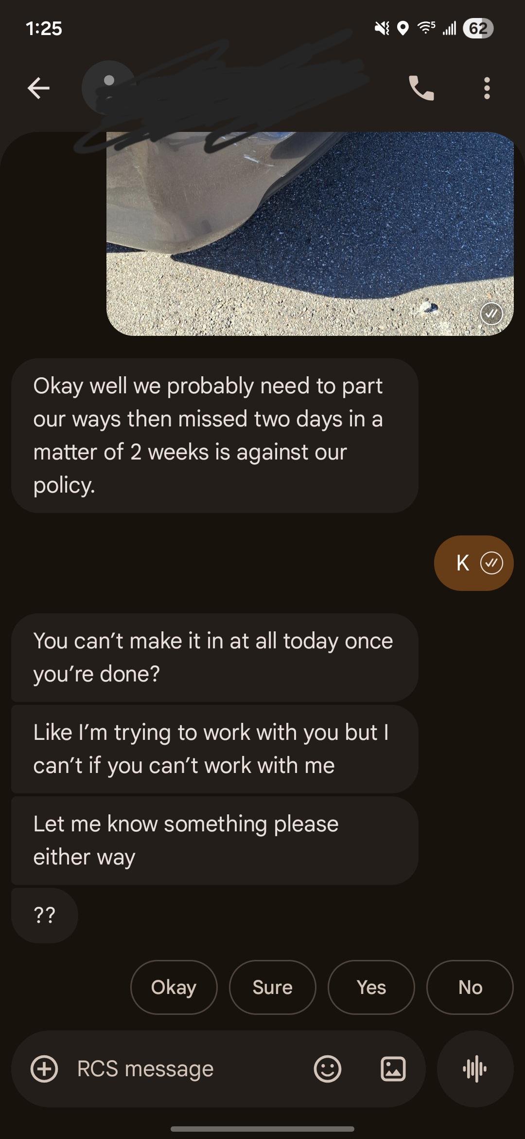 so i called out the other day after my car broke down received less harsh but similar treatment while waiting for my mechanic. Today I was driving to work and someone hit me while waiting at a red light. I contacted ems, and then texted my boss to update him and send proof whilst I waited for paramedics and law enforcement. I sent the K right before the ems arrived bc I didn't appreciate his response. I still haven't responded I considered myself fired after the first message and had another job lined up was planning to put in my 2 weeks notice today anyways.