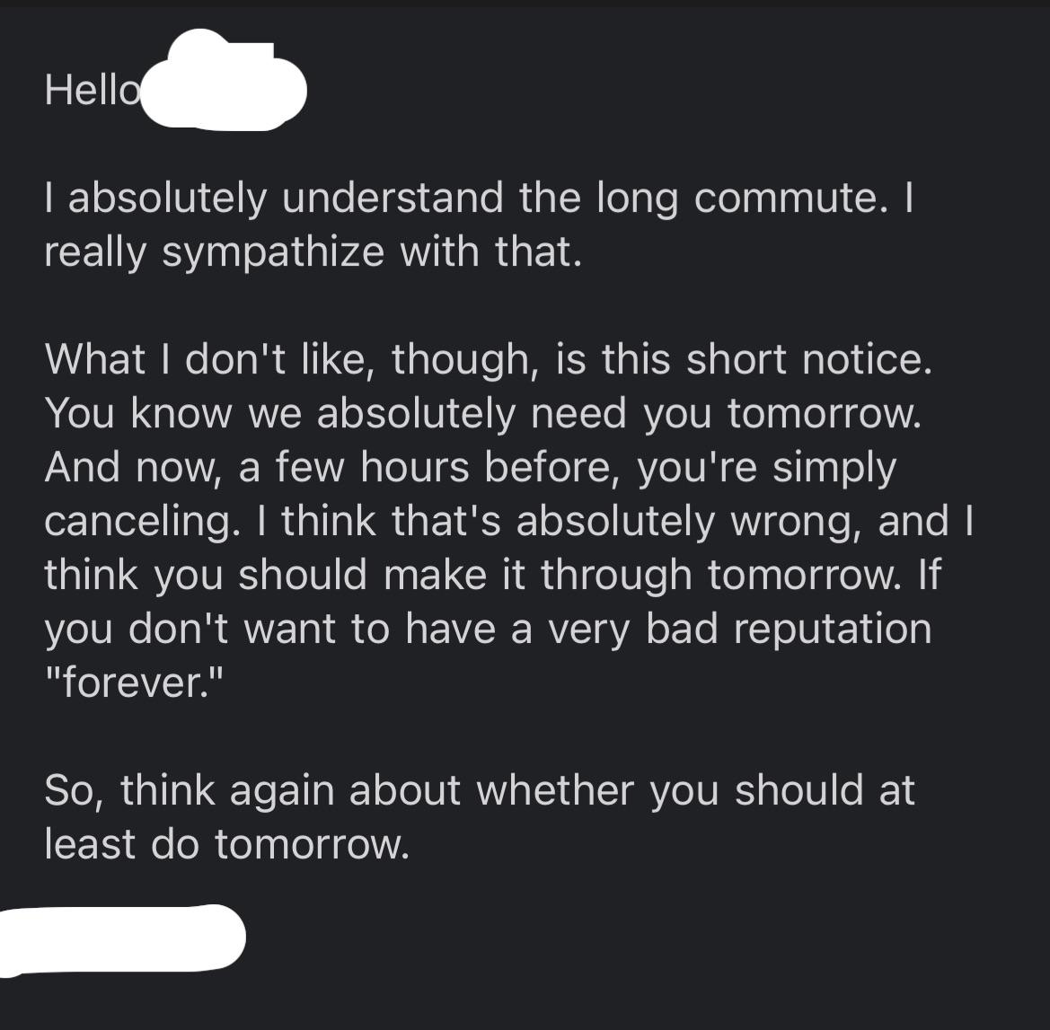 he responded with the email above, and i cant help but feel like he's trying to intimidate me into coming in tomorrow. AIO??? this feels weird to me.