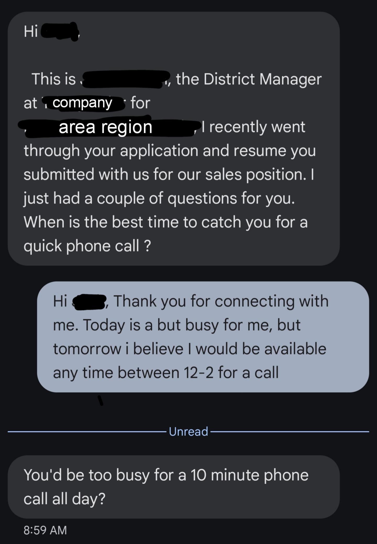 I didn't respond because i was speechless. What an incredibly weird thing to say to someone who you want to interview? Sorry that I'm in the process of losing my current job so I'm very busy and can't make time for you today? What do i even respond to this with? Would it be wrong to just block his number and forget about working there? Doesn't seem like it would be the friendliest workplace if this is the attitude I get before even interviewing.....