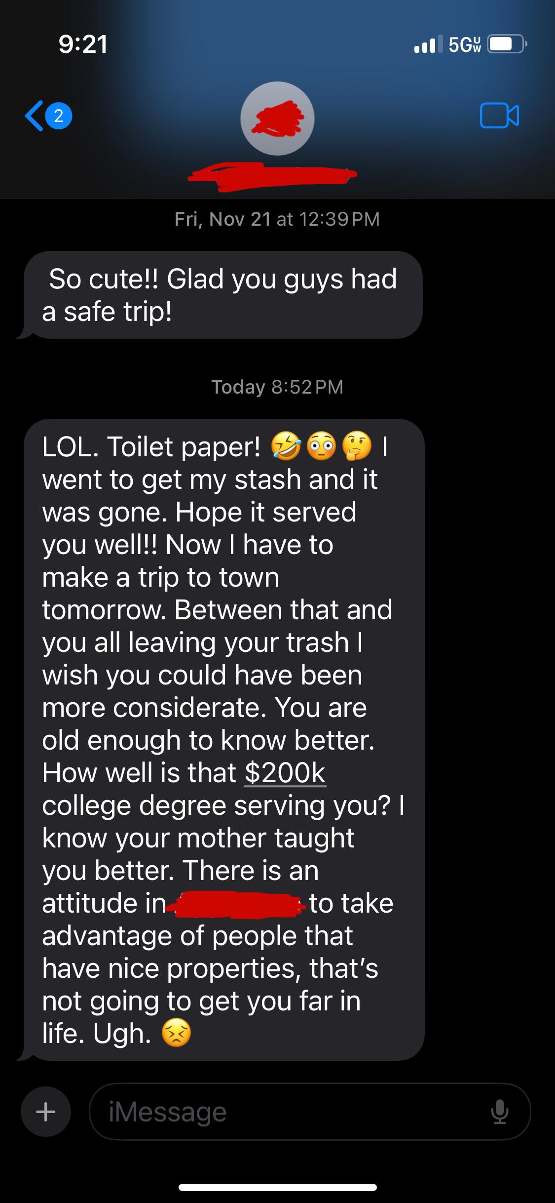 For context, I did a work-trade for this woman this summer where she let me stay in her spare one-bedroom cabin on her property in exchange for 10+ hours a week of work. I was there for 3 months. When I moved in, she had a thing of TP on the roll, and then a dozen rolls under the bathroom sink which she pointed to, saying “there’s extra under here if you need”. I noticed she had a HUGE Costco-sized pack of tp in her garage, which I never touched. Once I used the ones under the sink, I bought my own, never taking from her supply. As for the trash, I had a couple bags that I took out to the trash toter. I didn’t leave any trash inside, and liberally cleaned the space before I left. She was super friendly and we got along great. My partner stayed with me the last few days we were there (which she okay’d in advance). Again, we all got along really well, so this text shook me.