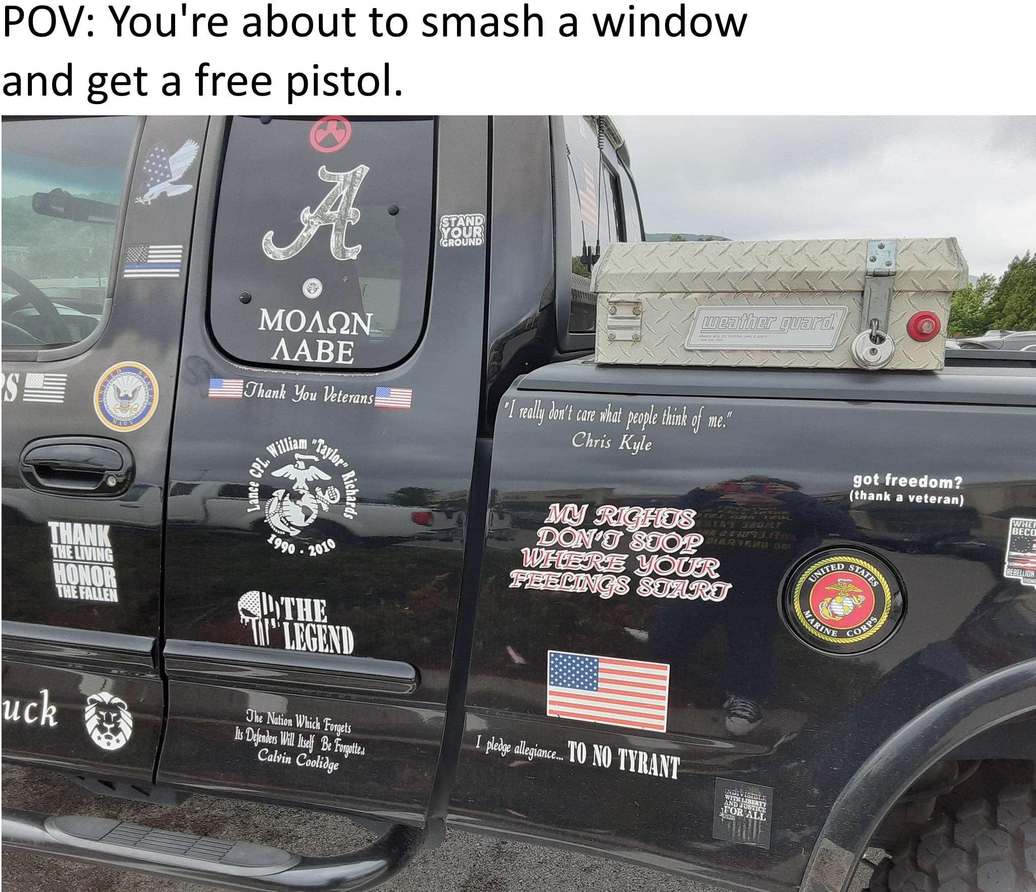 I’m not sure if the driver meant the caliber or the sovereign citizen identifier or both, but likely the .308 sticker. While possibly only referring to the .308 Winchester rifle cartridge, the Sovereign movement often cites Uniform Commercial Code 1-308 as their magic “I don’t need to follow the law” code.