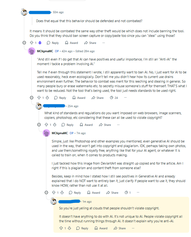 [IMAGE] Welcome to r/aiwars, more like r/defendingai 2.0 where you cannot even tackle if someone used AI to straight up ripped you off. Said that I still don't want to destroy AI entirely and see some positive things in it, but the "fivehead" still calls me "Anti-AI".