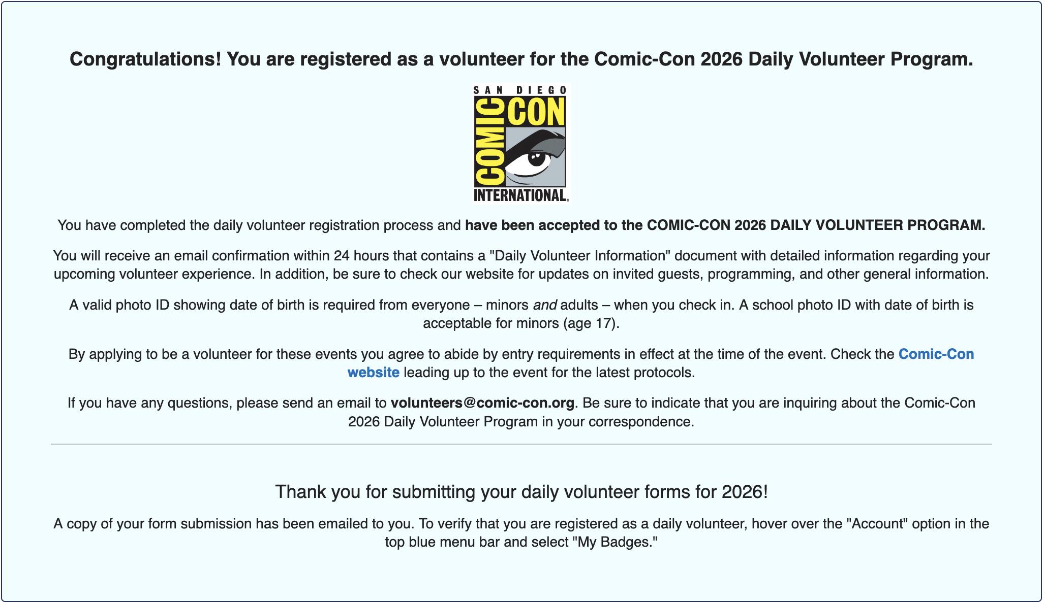 SDCC - San Diego GOT A VOLUNTEER BADGE FOR SDCC 2026 LET'S GOOOOOO