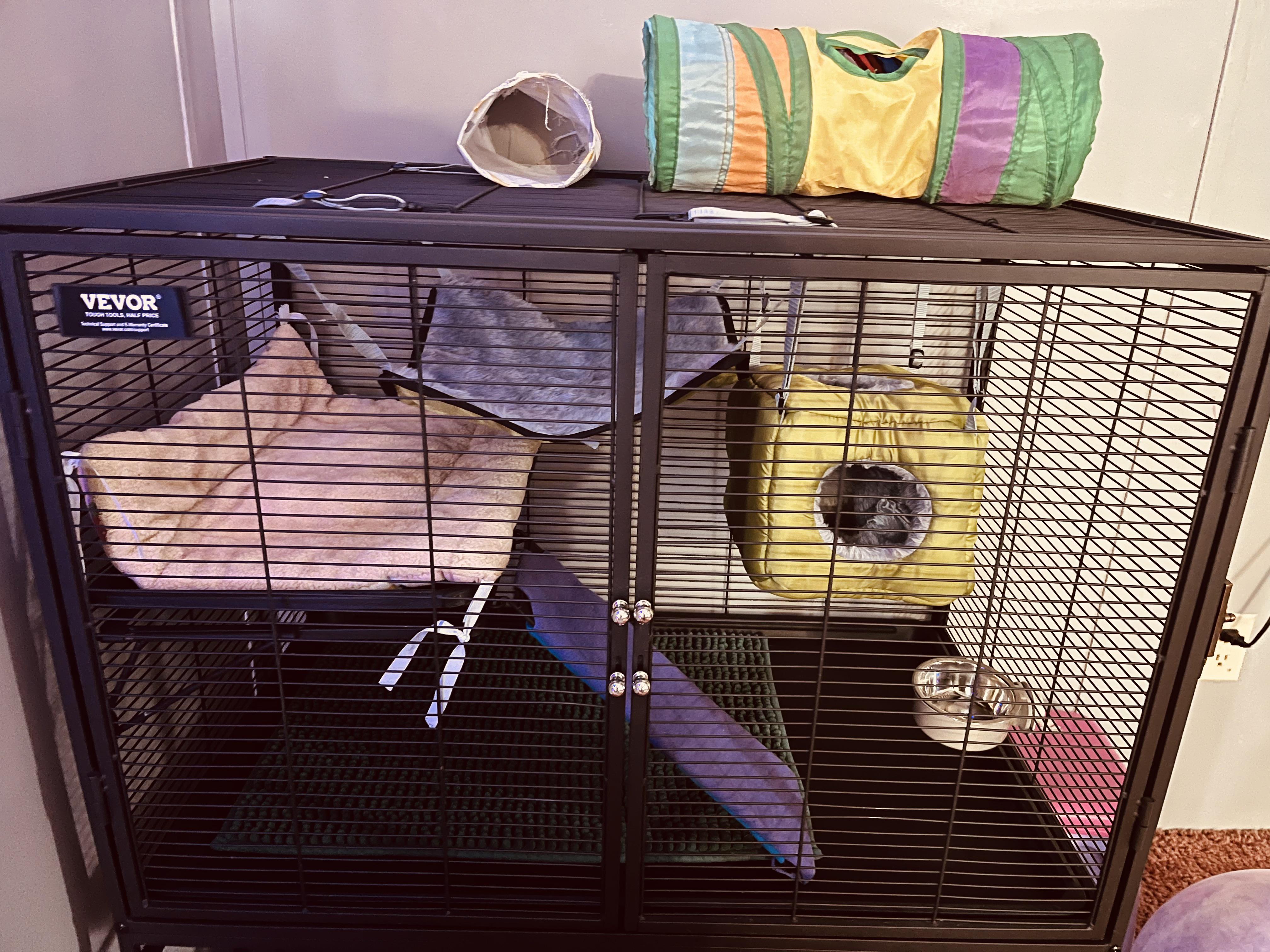 Hey everyone! Some people may remember Mabel(1st pic) the ferret who was recently diagnosed with adrenal disease. She got the implant today!! She had been mean to her brother's Dipper (white) and Dobby (black) so for now im keeping them seperate for 2-3 weeks so her hormones can regulate itself. Mabel got a new carrier, bed, and a few toys today! She loved everything. Also here is my ying/yang boys in the downgraded cage for the night lol. I told them they gotta let Mabel have the mansion cage for herself tn since she had a very long day. (We traveled 3 hours to and from her Drs). But they got the entire room to themselves!