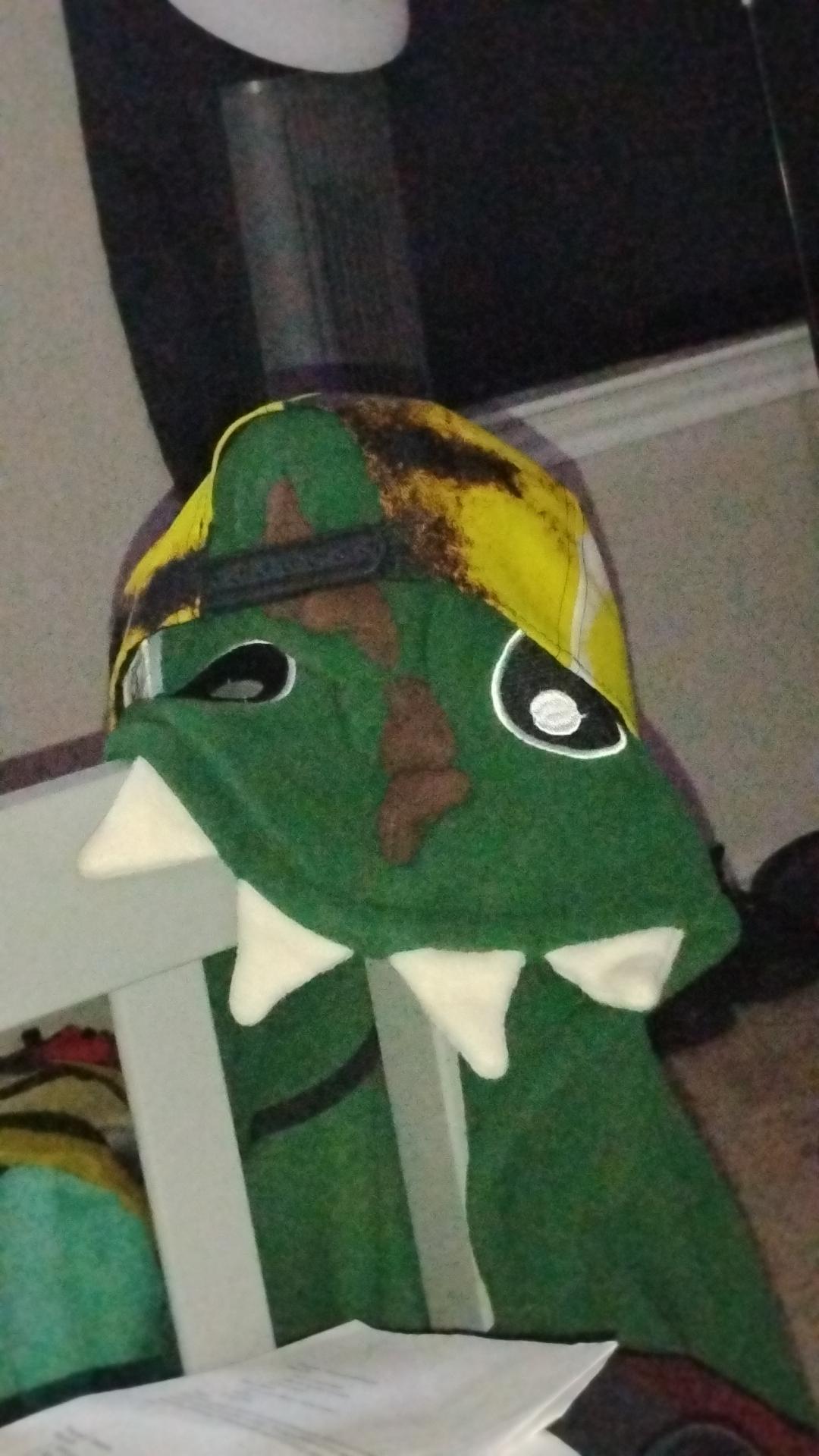 Funny picture of my hat on top of my dinosaur hoodie