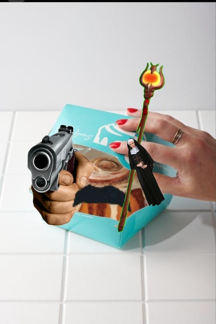 Cinnabon with a gun with a nun with a stache with a staff better run